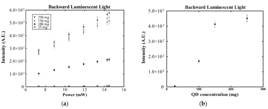 Figure 7 shows the backward luminescent performance of the four compound films with the increase of the power of the incident UV radiation, as well as the increase of the concentration of the QDs. Values for Figure 7b were obtained using 11.9 mW incident UV radiation power. The backward luminescent light, as shown in Figure 7a,b, has almost the same response as the forward luminescent light in Figure 5a,b, respectively. Direct comparison between forward and backward luminescent light for the four QD samples shows that when the QD concentrations exceeded the concentration of QD100, the incident UV photons interacted only with the very first layers of QDs due to the high QD density, thus producing luminescence very close to the incident surface of the compound film. The latter is presented in Figure 8 where it is clearly seen that after the concentration of QD100 the dominant luminescence is reversed from forward to backward.