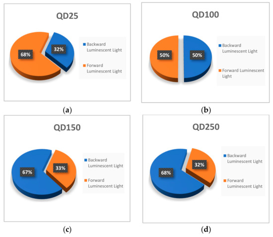(a) The percentage of forward and backward luminescence light for the compound film with a QD concentration of QD25; (b) the percentage of forward and backward luminescence light for the compound film with a QD concentration of QD100; (c) the percentage of forward and backward luminescence light for the compound film with a QD concentration of QD150; and (d) the percentage of forward and backward luminescence light for the compound film with a QD concentration of QD250.
