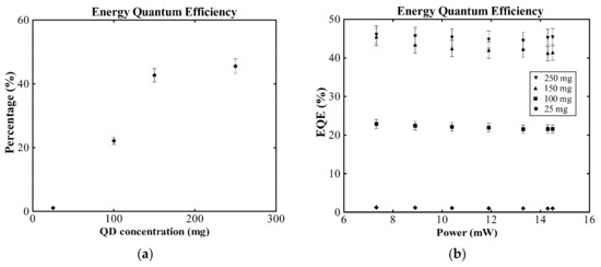 (a) The variation of the energy quantum efficiency (EQE) by increasing the concentration of the QDs in the compound films and (b) the variation of EQE by increasing the power of the incident UV radiation.