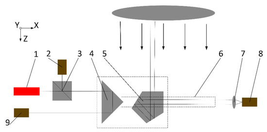 The optical beam sampling subsystem consisted of a pentaprism, a linear guide rail, and a CCD camera. The collimated light under the test was scanned by the pentaprism moving along the linear guide rail and was captured by CCD 8. The error compensation subsystem consisted of a laser, a beam-splitting prism, a right-angle prism, CCD 2, and CCD 9. The right-angle prism and the pentaprism were mounted on a supporting base and moved together along the linear guide rail. The right-angle prism was coated with a semi-transparent, semi-reflective film to ensure a reflectivity of 50%. There were manufacturing and assembly errors in the movement of the pentaprism on the linear guide rail. The variation of the radial thickness caused the pentaprism to roll and the variation of the axial thickness caused the pentaprism to pitch. A straightness error caused the pentaprism to yaw. These three errors were rotations around the X-axis, the Y-axis, and the Z-axis, respectively. When the pentaprism had yet to rotate, the light emitted by the laser passed through the right-angle prism and was split into two beams. One beam was directly reflected back to the beam-splitting prism and received by CCD 2. The other beam was reflected by CCD 9 after being reflected twice. When the pentaprism rotated around the axis, the right-angle prism also rotated. Therefore, CCD 2 received a light beam that changed due to the rotation around the Y-axis and CCD 9 received a light beam that changed due to the rotations around the Z- and X-axes. Lastly, CCD 8 received the light beam that carried errors on the collimated wavefront.