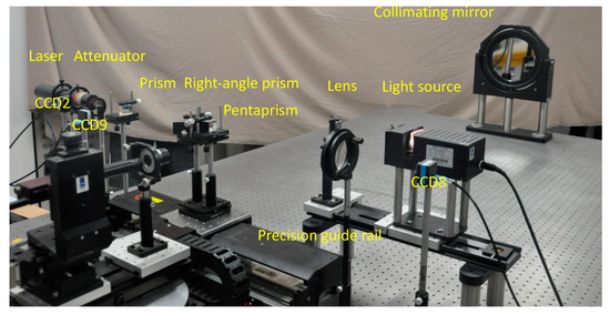 Figure 3. The high-precision electronically controlled translation stage was a custom-made marble guide rail and a linear motor-driven micro-translation stage with a displacement resolution of 1 nm and a positioning repeatability of 0.5 μm. For the size of the pentaprism, a smaller optical aperture was selected to improve the detection accuracy of the collimated wavefront with a large aperture. However, the size of the pentaprism was also constrained by the illumination intensity of the beam to be measured; if the size is too small, the optical intensity of the sampled beam is weak. Insufficient luminous flux makes it difficult for CCD cameras to detect valid signals and can lead to difficulties or failures in centroid determination. Therefore, a pentaprism with an optical aperture of 10 mm,