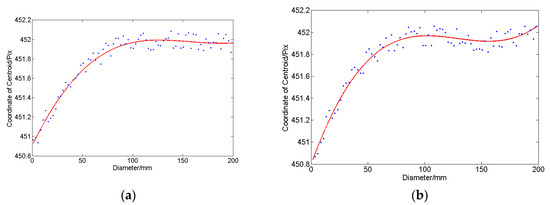4]. As the stage moved, the spots were obtained by continuous sampling from 0 to 220 mm. The pixel centroid coordinates from the camera were obtained using the centroid algorithm. The data is shown in