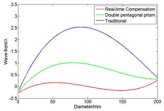 2], and the real-time compensation method proposed in this paper, were 2.65 λ and 0.712 λ, 1.208 λ and 0.360 λ, and 0.512 λ and 0.115 λ, respectively. The wavefront curve after de-tilting and defocusing was generally consistent with the nominal value distribution. The calculations show that the residual for the PV value was 0.072 λ, and the residual for RMS was 0.041 λ. It can be seen that the real-time compensation pentaprism scanning wavefront detection method isolated the guide rail errors and effectively improved the measurement accuracy.