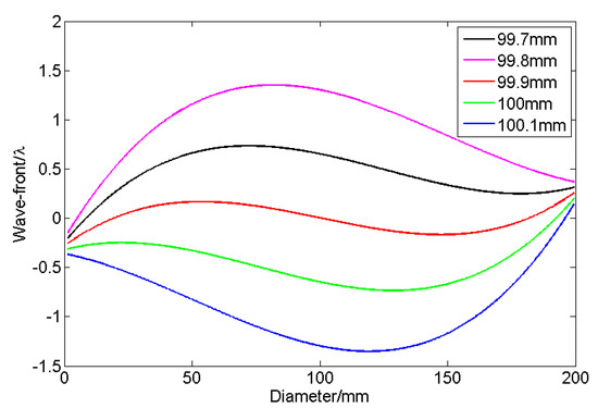 Figure 6, which correspond to the focal positions of 99.7 mm, 99.8 mm, 99.9 mm, 100 mm, 100.1 mm, 100.2 mm, and 100.3 mm. The results of the analysis indicated that when the lens focal length was 99.9 mm, the residual of the fitted curve for the emergent wavefront in the sagittal direction, as well as the residual for the actual wavefront, were the smallest, with a PV value of 0.512 λ and a residual of 0.072 λ, respectively. Significant defocusing errors occurred in several other focusing positions. Due to manufacturing-related errors of the optical components, experimental analysis can be performed by increasing the step resolution based on the desirable detection accuracy requirements.