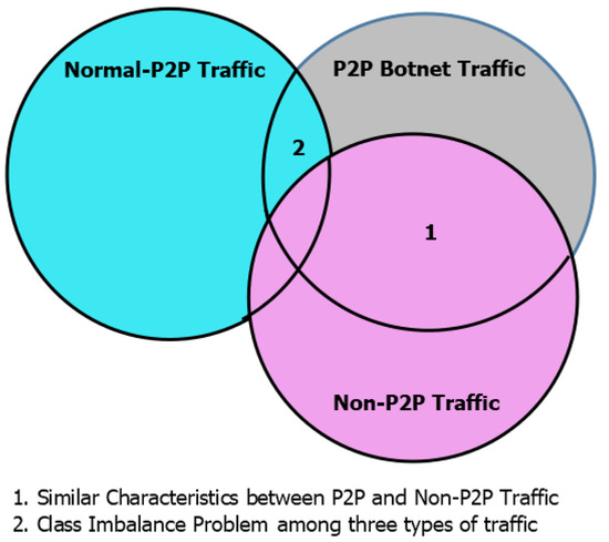 Three unique qualities of communication, i.e., P2P botnet, non-P2P and, Normal P2P activity, are demonstrated in Figure 2. These three characteristics overlap each other. If the three types of activities are grouped into a single stage mechanism, a large part of the P2P botnet traffic with normal qualities for non-P2P activity could be misclassified and few substantial P2P streams could be misclassified as countless streams due to the class imbalance problem. In this way, a single phase mechanism doesn’t have the capability to order the traffic of three different qualities at the same time.