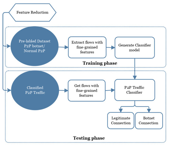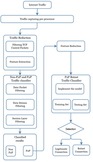 This section describes the method proposed in this paper to detect bot-bling traffic in phases. The focus of this method is on non-P2P traffic filtering and the extraction of the characteristics of the session. The architecture of the model is shown in Figure 3. The first stage of the model will start from the traffic reduction followed by the three aspects of packet filtering rules, session characteristics, and classification algorithm. The second layer further classified the captured network traffic into two classes such as non-P2P and P2P. At the third layer of the model, we reduced the features which may marginally affect the classification. The final layer of the model classifies the traffic as either the traffic is normal P2P or botnet traffic. The detailed discussion on the entire mechanism of the proposed scheme is given in the rest of this section.