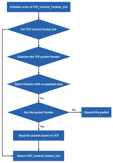 In this study, TCP traffic control packets are filtered to reduce network traffic volumes and improve the efficiency of the envisaged strategy. Filtering involves mainly two steps: filtering the network flow associated with the TCP protocol and obtaining the control packets SYN, ACK, FIN and RST TCP. Figure 4 displays the network traffic reduction process (.PCAP files). An array of TCP Control Packets lists is initialized in the flowchart. New packets (TCP Control Packets List) are added to the array by tuples through the packets until the last packet in the file is reached. After the first loop i.e., for loop, the next loop examines the TCP packet header for loop, and the third loop selects packets without payload data. The flowchart’s final loop gets the packet header.