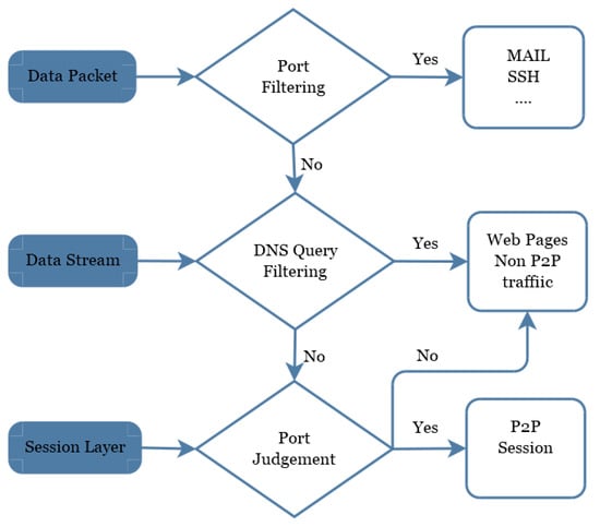 At present, port identification, signature recognition, and DNS query identification are commonly used methods for P2P traffic identification. These methods are based on stream feature [21]. However, the port identification method cannot recognize P2P applications with random ports or custom ports. DPI (Deep Packet Inspection Technology) does not recognize encrypted P2P traffic [32]. Stream-based identification methods can only determine P2P applications of the partial flow and has a high false alarm rate. Therefore, we use non-P2P well-known port filtering mechanism, DNS query, flow counting rules to filter non-P2P traffic, combined with fast heuristic P2P traffic identification method, as shown in Figure 5.