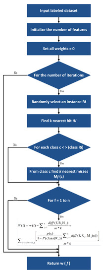 The purpose of this study is to select an appropriate subset of features that will enhance the efficiency of the machine learning classifiers and reduce model complexity without drastically reducing the precision. We used a classification technique for feature reduction to eliminate less important features in order to reduce the amount of data, in order to achieve better levels of accuracy. The decision tree consists of two node types: two children’s internal nodes and children’s leaf nodes. Any internal node has a decision mechanism to demonstrate the next node to visit. Training samples containing a number of features starts the construction of the tree. During construction of the tree, the training set is repetitively divided into small subsets. A predicted class is assigned to each resulting node based on the decision matrix of the class distribution in the training set. The internal node test is determined on the basis of an impurity measurement to pick the selected function and threshold values. The most common impurity metric is entropy impurity [38], which we used for feature reduction, is shown in Figure 6.
