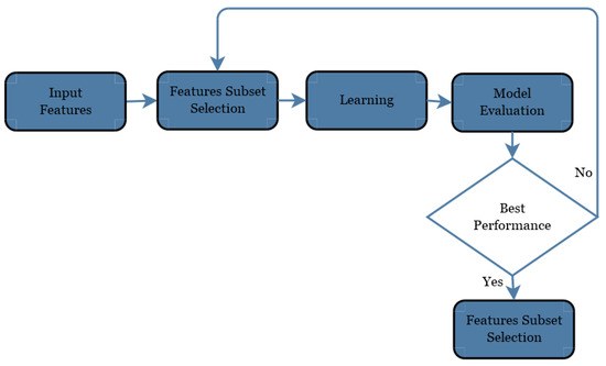We assessed the execution of our methodologies utilizing 10-fold cross-validation. The methodology of k-fold cross-validation. The first sample was arbitrarily apportioned into ten equivalent measured sub-tests. Nine sub-tests were utilized for training the model and the remaining one sub-test was held for testing the model. The procedure was rehashed ten times, utilizing an alternate sub-sample for testing, every time. The outcomes then found the average values for the single and final results. Furthermore, we used the wrapper method for feature selection. The mechanism of the wrapper technique is shown in Figure 8.