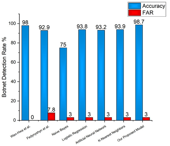 Using the Naive Bayes classification algorithm, Logistic Regression, Artificial Neural Network, and K-Nearest Neighbor, the detection rate was 75.5% and 93.8%, 93.2% and 93.9%, respectively. However, the results of Decision Tree algorithm was significantly higher as 98.7%. Therefore, the Decision Tree algorithm for various types of P2P botnet traffic detection is more accurate than the other four classification algorithms. Moreover, the proposed method was also compared with previously published work as Wen-Hwa et al. [53] achieved 98% with a 0 false alarm rate, while they did not quantify the behaviour of the captured packets. However, with such a low false rate, the normal traffic flow will be very challenging. Another solution was proposed by Fedynyshyn et al. [54], where they achieved 92.9% with a relatively higher false alarm rate of 7.8% and they proposed a method to detect only IRC and C & C traffic.