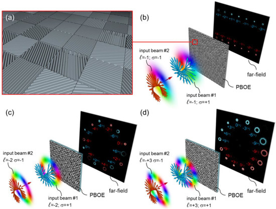 being f the focal length of the lens which is used for far-field reconstruction in f-f configuration, and k = 2π/λ, where λ is the working wavelength. When the optical element is illuminated with an integer OAM beam, the projection of the beam is optically performed over the selected OAM set, and a bright spot appears at the position corresponding to the input OAM value in far field (Figure 1) [23].