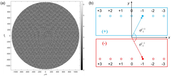 The diffractive element is basically a computer-generated hologram originated from the linear combination of n fork-holograms. Each term in Equation (1) is given by the interference pattern of the jth OAM-mode with azimuthal phase term exp(iℓjϑ) with the tilted plane-wave exp(iαju + iβjv) defined by the corresponding carrier frequency. In the Fourier plane, the carrier frequencies manifest as separate spatial coordinates {(xj, yj)} given by: