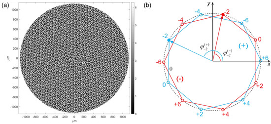 (a) Numerical phase pattern for the demultiplexing of optical beams with OAM in the set {−6, −4, −2, 0, +2, +4, +6} on a heptagonal configuration. Pixel size: 6.250 μm × 6.250 μm. 16 phase levels. Radius length: 180 pixels. (b) Far-field channel scheme for the given OAM set and circular polarization states. Right-handed (in blue) and left-handed (in red) circularly-polarized OAM beams are detected in far field on two distinct heptagons.