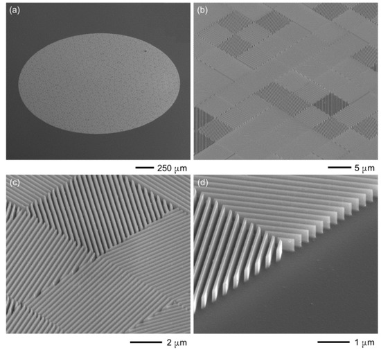 After a 13-second O2 treatment to remove the residual layer, a 10-nm Cr hard mask was deposited by e-gun evaporation and the transfer of the resist pattern was carried out by a lift-off process in a sonicated acetone bath for 180 s. Finally, an ICP-RIE etching was performed to remove the residual layer and hence obtain the required grating thickness. The etching time was finely adjusted to reach a final depth around 535 nm, as recommended by numerical simulations. In Figure 5, inspections at scanning electron microscopy (SEM) of the final sample are shown. In particular, the well-defined line profile is evidence of the suitability of the nanofabrication recipe for pattern transfer onto the silicon substrate.