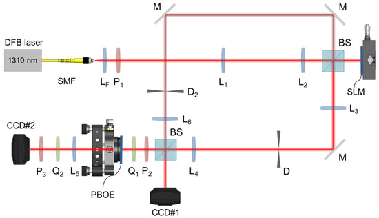 Experimental setup used for the optical analysis of the fabricated Pancharatnam–Berry optical elements (PBOE). The output of the DFB laser (λ = 1310 nm) is collimated after a single mode fiber (SMF) using an aspheric lens (focal length fF = 7.5 mm), linearly polarized (P1) and magnified with a first telescope (f1 = 3.5 cm, f2 = 10.0 cm). The first order of the spatial light modulator (SLM) used for OAM-beam generation is filtered (D) and resized (f3 = 20.0 cm, f4 = 12.5 cm) before impinging on the demultiplexer. A beam splitter (BS) is exploited both to check the input beam and collect the output intensity at the back-focal plane of a fifth lens (f5 = 7.5 cm). A sequence of quarter-wave plates (Q) and linear polarizers (P) is placed before (P2, Q1) and after (Q2, P3) the sorter, in reverse order, in order to control and select the desired circular polarization. A Mach–Zehnder interferometric setup is used to analyze the spiralgram of the input optical vortices and infer the carried OAM value and sign.