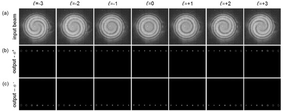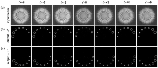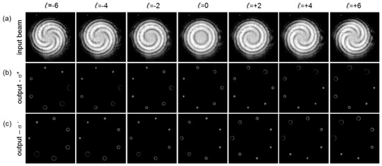 In Figure 7, the optical characterization is reported for the PBOE performing OAM sorting in the range {−3, …, +3} with OAM step Δℓ = 1 (Figure 7a). In Figure 7b,c, the far field is shown for input beams with right-handed and left-handed circular polarizations, respectively. As expected, the demultiplexer can sort the orthogonal polarization states onto two different linear arrays, while the OAM value is detected correctly according to the scheme in Figure 2b. A similar analysis is reported in Figure 8, for the PBOE performing OAM demultiplexing in the range {−6, …, +6}, step Δℓ = 2, according to the scheme in Figure 3b. In Figure 8b,c, the far field is shown for input optical vortices with right-handed and left-handed circular polarizations, respectively. The demultiplexer separates the orthogonal polarization states onto two heptagons, while the OAM content is detected correctly. Figure 9 reports the optical analysis of the PBOE performing sorting in the OAM range {−9, …, +9}, step Δℓ = 3, over a circular configuration, as depicted in the scheme in Figure 4b. In Figure 9b,c, the far field is shown for input vortices with right-handed and left-handed circular polarization, respectively. As expected, the demultiplexer can distinguish between orthogonal polarization states, by projecting them onto two complementary, i.e., non-overlapping, semicircles.