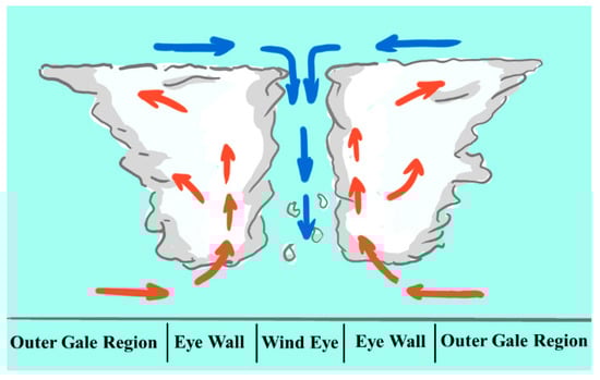 Typhoons are a kind of extreme weather with a large-scale vorticity system. Based on the structural characteristics of typhoon, it is usually divided into three parts: wind eye region, eye wall region and outer gale region. The eye area of a typhoon exhibits the subsidence airflow and the speed of the wind is so low that it can be ignored. The characteristics of wind field in the outer gale region are similar to the normal situation, where the destructiveness is small. However, there are extreme gusts, turbulent fluctuations and sudden changes of wind direction in the eye wall region that lead serious hazards to the large offshore wind turbines [1,2,3,4]. The schematic of the physical phenomena is shown in Figure 1. By the observations of strong typhoon such as “Hagupit” and “Parrot”, it is found that there exist more extreme gusts during the 10-min observation of typhoon than the normal wind, the wind speed can change 17.6 m/s in 3 s, and the wind direction can change 28 degrees [5] in 6 s. Furthermore, the three-dimensional turbulence is so extreme that the turbulence intensity in the longitudinal direction can reach 18% (the reference value of IEC61400-1 standard is 12% [6]), which greatly exceeds the prescribed limit value by the design standard.