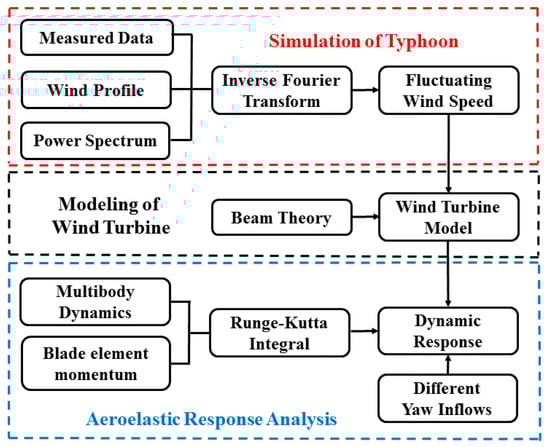 The research of dynamic simulation of wind turbine under typhoon mainly includes three parts: simulation of typhoon fluctuating wind, modeling of wind turbine and aeroelastic response analysis. The whole framework is shown in Figure 2. Combined with the inverse Fourier transform method, the fluctuating wind is simulated by the power spectrum to record from the measured data of typhoon. A 6 MW wind turbine is modeled, the aerodynamic loads and aeroelastic are calculated by the blade element momentum and multibody dynamics. The aeroelastic responses and ultimate loads of the wind turbine at different inflow angles of typhoon are studied.