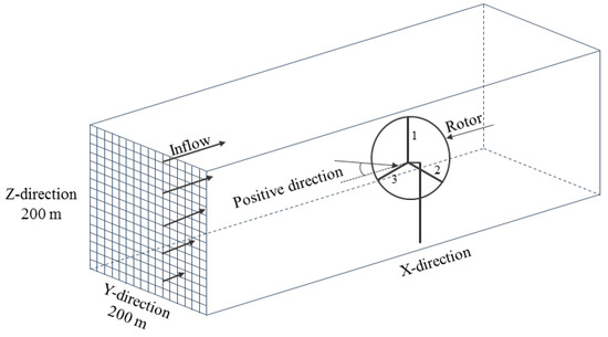 Based on the beam theory, a commercial 6 MW offshore wind turbine is modeled. The specific model parameters are given in Table 1. The first and second natural frequency of blades and the tower are calculated. The total simulation area of the typhoon is 200 m × 200 m, which is discretized into 256 nodes, covering the whole rotor, as shown in Figure 3. The position and direction of the blades are also indicated with the state of parking. In the process of dynamic calculation, the flow direction facing the rotor is 0 degrees, clockwise, it is positive and counterclockwise, it was negative. In this paper, the aeroelastic response of the complete wind turbine is calculated in seven cases at yaw angles of 0, 30, 60, 90, 120, 150 and 180 degrees.