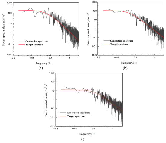 Figure 4 shows the comparison of the fluctuating power spectral intensities in the three directions between the simulated and measured results. The generated spectrum fluctuates around the target spectrum, and there is no large deviation, demonstrating that the turbulence characteristics of the simulated fluctuating wind are in line with the measured actual typhoon. In addition, the longitudinal fluctuating energy is higher than the other directions, and the vertical energy is the lowest, which corresponds to the fluctuating wind speed in the three directions. In addition, the fluctuating wind using the Kaimal spectrum and Von Karman spectrum that are commonly used in the specification were also simulated, and compared with the results of the measured typhoon spectrum. At the hub height of the wind turbine, the turbulence intensities of the three fluctuating wind were 10.83%, 10.35 and 13.89%, respectively. In order to quantify the error of the numerical results, Table 2 shows the comparison of the turbulence intensities in three directions between the simulated and the measured results at the height of the anemometer. The results simulated by the proposed method in this paper are in good agreement with the measured ones. The most important longitudinal error for wind turbine dynamics simulation is only 1.7%, and the turbulent fluctuation is higher than the recommended spectrum in the standards; this difference reflects the particularity of typhoon. Figure 5 shows the fluctuating wind speed in three directions at the hub height of the wind turbine. The longitudinal inflow fluctuation reaches a value of 36.73 m/s. The horizontal and vertical fluctuation amplitudes are reduced, but the minimum vertical fluctuation amplitude still reaches to 13.06 m/s, which reflects the strong fluctuation of typhoon wind.