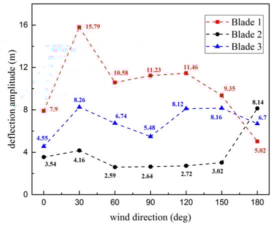 Figure 6 shows the maximum tip displacements of three blades in the direction of the flap at yaw angles of 0, 30, 60, 90, 120, 150 and 180 degrees under typhoon. The height of blade 1 is the highest, which means that the wind speed was higher, so the total vibration of blade 1 is significantly more intense than that of the other blades. Since the yaw angle is defined as the left side of the inflow axis is positive (Figure 3), there is a positive superposition between aerodynamic and inertial load of blade 3. On the contrary, the aerodynamic and inertial loads on the blade 2 are partially offset to each other, resulting in a weakened load on the blade, and the overall vibration is slightly lower than that of blade 3. It should be noticed that, influenced by extreme fluctuating wind speed of typhoon and the combined force of lift and drag, the blade displacement reaches a maximum at this angle of attack, and the maximum displacement of the blade tip reaches 15.79 m at yaw angle of 30 degrees. As a result, it may lead to serious safety hazards of blade yaw angle of 30 degrees caused by large ultimate loads.
