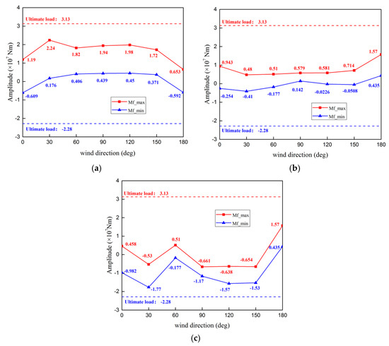 In order to illustrate the relationship between the ultimate design loads and the response loads under typhoon, we calculate the ultimate design loads of the blade and tower of the 6 MW wind turbine according to GL2010 standards. In addition, the dynamic loads in 10 min under different inflow conditions in the direction of the flap are also studied, and the maximum/minimum values are compared with the ultimate design loads. Figure 7 shows the comparison of the flap bending moments at the root of three blades, in which the negative value represents the direction, the red and blue curves are the maximum and minimum, respectively, and the dashed line is the ultimate design load. From the series of curves, the maximum bending moment appears at yaw angle of the 30 degrees of blade 1, and the maximum value is 2.24 × 107 Nm, which reached 71.5% of the ultimate design value according to GL2010 standards, and the minimum value is −1.17 × 107 Nm (the negative sign indicates that the direction of flapwise moment is negative), occurring at blade 3 at the inflow angle of the 30 degrees. The results show that the loads on the blades of wind turbines did not exceed the ultimate value, but the average wind speed of the typhoon simulated in this paper is only 40 m/s, far less than the ultimate wind speed of 70 m/s in the specification, and the maximum load is very close to the ultimate value.