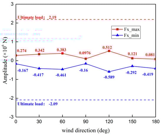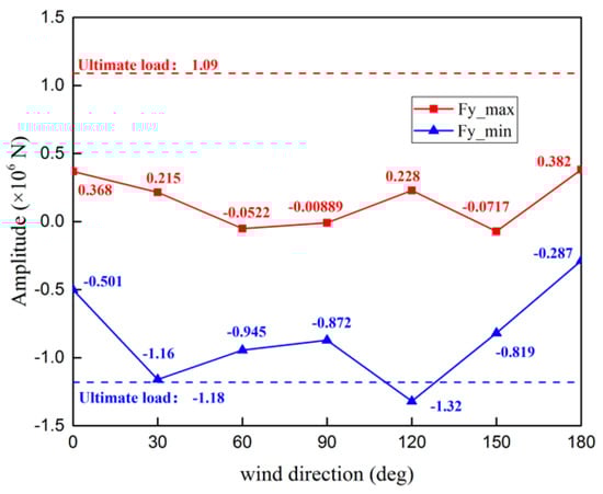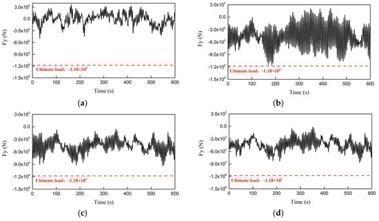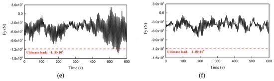 The dynamic response of the tower under the typhoon is also analyzed. Figure 8 and Figure 9 show the results of the load on the top of the tower and the ultimate design values under different inflow conditions. When the inflow yaw angle is 120 degrees, the minimum load in the y-direction exceeds the design extreme value of the model. When the inflow angle is 30 degrees, it is very close to the design ultimate value. Figure 10 shows the load variations in the y-direction within ten minutes under six yaw inflow angles. When the inflow angle is 30 degrees and 120 degrees, respectively, the amplitude of vibration load is higher than other conditions, which means that more vibration energy is included in these cases. The above results show that, if the typhoon enters the flow at these two yaw angles, and if the yaw system does not adjust in time, the tower could be damaged.