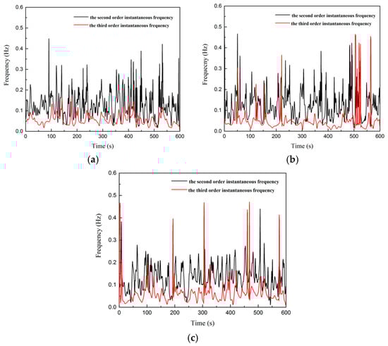 In order to further study the particularity of the typhoon and its influence on the structure of wind turbine, the modal decomposition of the fluctuating wind speed is carried out in the frequency domain, and the instantaneous frequency of the intrinsic mode is obtained by the Hilbert-Huang transformation (HHT). The HHT methodclearly shows the frequency of structural response variation with time [43]. In practice, the range about structural frequency which is greatly affected by the fluctuating wind is between 0.1 Hz and 1 Hz. Figure 11 shows the instantaneous frequency in the three kinds of the fluctuating winds simulated by the different power spectrums which are located among the above frequency range. The black curve is the second order instantaneous frequency and red is the third order instantaneous frequency. The second order instantaneous frequencies in Figure 11a,b fluctuate sharply between 0.1 to 0.5 Hz, while most of the second order peak frequencies in Figure 10c are concentrated between 0.2 to 0.3 Hz. Table 1 shows that the first natural frequencies of the wind turbine blades and the towers are observed in this range, so the energy of typhoons can be more easily resonant with the structure. According to the third-order instantaneous frequency, it is found that the peak of Figure 11a changes very slightly, but there are obvious abrupt changes in Figure 11b,c. These differences show the non-stationary characteristics of the typhoon.