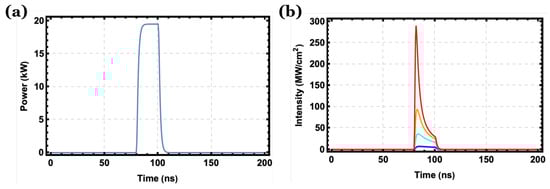 where L is the length of the gain medium. An example of a calculation using Equation (5) is shown in Figure 1. The graph based on Equation (5) shows not only the pulse shape change that is induced by the depletion effect but also the total energy increment. However, as depicted by the blue curve in Figure 2a,b, the more simple and practical energy gain equation given by Equation (6) merely results in an average increment in the pulse energy.