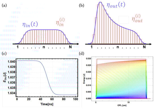 A numerical method that achieves amplification of the pulse shape and energy simultaneously by using the energy gain equation given in Equation (6) is introduced [19]. In this method, as shown in Figure 2a, the input pulse, , is treated as a consecutive train of square-shaped pulses with the same pulse duration but different amplitudes. The amplitude of the i-th square pulse is , where the superscript indicates the sequence of the square pulse, i is an integer larger than one, and is the duration of the small square pulses. In addition, the uniformly distributed inversion density, , is renewed for each square pulse by counting the stimulated emitted photons. The equations for the i-th pulse amplification are