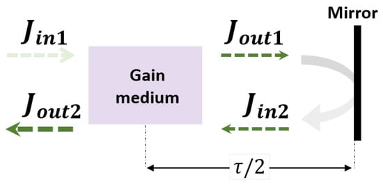 The above-described numerical method is based on the Frantz-Nodvik energy gain equation of Equation (6). There also exist modified Frantz-Nodvik equations for more complex amplifier geometries such as a zig-zag slab [26] and multiple passes in a thin disk [27]. In the case of a double-pass in multiple rod-shaped medium, a modified Frantz-Nodvik equation for two inputs [19] can be used with the above-described numerical method (Figure 3). The modified Equations (7) and (8) for two inputs are