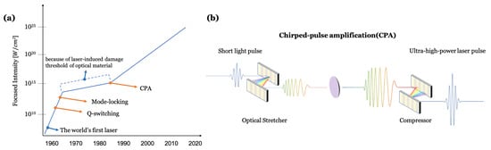 (a) History of laser intensity [40] and (b) a schematic of a chirped pulse amplification (CPA) system [25].