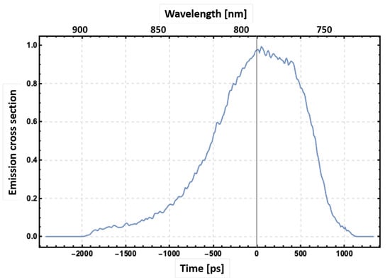 The spectral emission cross-section, , can be obtained from a fluorescence spectrum measurement and the McCumber theory [28,41], and an example with Ti:sapphire is shown in Figure 5. The time-dependent wavelength, , depends on the structure and configuration of the stretcher and can be calculated by using a wavelength-dependent group delay function.