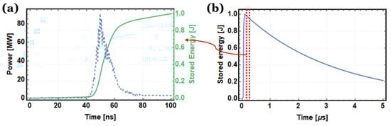 where is the effective pump rate [cm s] and is the fluorescence lifetime [s] of the gain medium. Equation (18) is relevant even when the seed and the amplified pulses do not exist. When there is no seed pulse, in Equation (18), is zero and is also vanishes based on Equation (7) or Equation (14). As shown in Figure 6a, as the pump pulse is absorbed by the gain medium, the number of inversion ions , i.e., the effective stored energy, increases. As shown in Figure 6b, the stored energy decreases with the spontaneous emission even when there is no stimulated emission from the seed pulse. The spontaneous decay time is characterized as the fluorescence lifetime of the medium. By performing a simulation similar to the example shown in Figure 6, one can estimate the maximum stored energy and time required for the stored energy to reach the maximum. The stored energy is typically lower than the effective total pump energy because of the spontaneous emission loss, and the instantaneous moment at which the stored energy is highest is the best seed pulse injection timing in the single-pass amplifier.