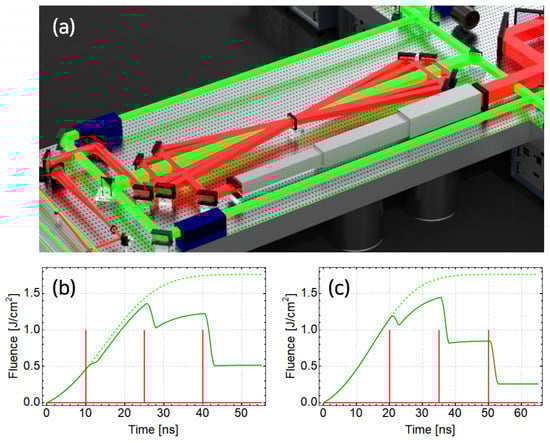 A Ti:sapphire amplifier is widely used in terawatt(TW) or petawatt(PW) CPA laser systems [8]. Figure 7a shows an example of a PW-class, tens of Joule pulse energy, fs pulse width, and multi-pass amplifier. In case of Figure 7, for 2.2 PW of peak power, 120 () J of pump energy, 2-stage of 3-pass amplifiers, 17.7 fs of pulse width, and 67.9 (48.6 after compression) J of pulse energy are assumed. In such a CPA system, the stretched seed pulse duration is a few nanoseconds and it takes tens of nanoseconds to pass through the multi-pass power amplifier [3,17,44]. Spontaneous emission would be negligible because the duration of amplification is much shorter than the fluorescence lifetime of the Ti:sapphire medium (3.2 μs [28]). However, it is important to consider instantaneous pumping in a multi-pass amplification simulation because, as shown in Figure 7b,c, it allows tracing the stored energy changes in the entire amplification process.