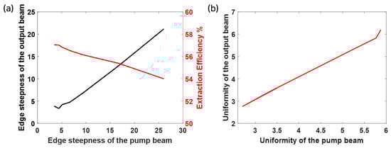 (a) Edge steepness of the pump beam and the energy extraction efficiency, (b) The spatial uniformity of the pump beam and the amplified beam according to the design parameters of the beam shaping system; .