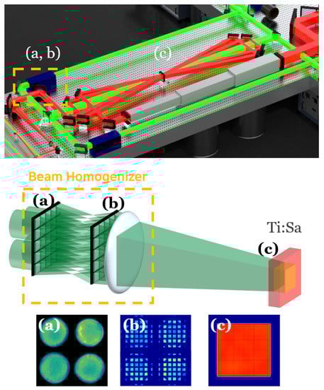 - Hwang, S.J.; Kim, T.; Lee, J.; Yu, T.J. Design of squared-shaped beam homogenizer for petawatt-class Ti:sapphire amplifer. Opt. Express 2017, 25, 9511–9520. [Google Scholar] [CrossRef] [PubMed]
