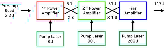 Owing to features such as excellent thermal conductivity, high mechanical durability, and wide amplification bandwidth, Ti:sapphire is widely used as a medium for high-power chirped pulse amplification (CPA) technology [1,2]. Some researchers from RAL, SIOM, PEARL, Apollon Project, and APRI, ELI, J-KAREN, and Vulcan have previously generated several petawatt (PW) laser pulses and are targeting 10 PW or more [3,4,5,6,7,8,9,10,11]. A high-power laser can be used in applications such as laser–material interaction, particle acceleration, basic research about materials under extreme environments, and medical applications [12,13,14]. In addition, the realization of high-power laser applications will enable the pioneering of new scientific fields [8,15]. However, for using high-power lasers in scientific research and industrial applications, it is essential to have high-power pulses with both a high repetition rate and high spatio-temporal stability for practical applications [16,17]. The simulation model and analysis of the high-power laser amplifier introduced in this review will be useful for the design and development of laser systems.