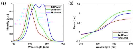 Because the phase shift in amplification is superimposed, the atomic phase shift effect in a laser amplifier chain is obtained by adding all the phase shifts generated in each amplification pass. To investigate the effect of the pulse distortion caused by the atomic phase shift in an amplifier chain structure, as shown in Figure 10, the amplifier simulation introduced in the previous section and the phase shift have to be combined. Figure 11 shows the output spectrum and accumulated atomic phase shift of each amplifier. The distortion in the phase shift due to the gain depletion effect is reflected in the asymmetric phase shift with respect to the center of the spectrum. The phase shift caused at each amplification stage is superimposed and distort the peak power and pulse width of the compressed pulse in the pulse compression as shown in Figure 12.