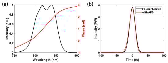(a) The output spectrum of the amplifier chain and the accumulated atomic phase shift, (b) the compressed pulse distortion due to the atomic phase shifts.
