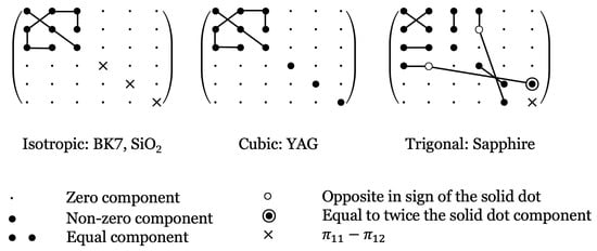 Thermal birefringence is caused by thermal stress [1]. Thermal stress and the relative impermeability (B) are related to the -tensor (piezo-optical tensor, Figure 13) [60,61]. The square root of B is the refractive index. The refractive index change induced by the heat can be expressed by Equations (24)–(26),