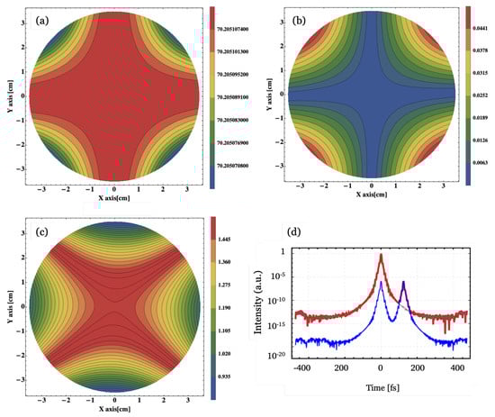 Using the above matrices, a first-order differential equation can be obtained, as expressed in Equation (32). By solving Equation (32), we were able to obtain the shape of the phase distortion due to the thermal birefringence. The distortion due to the thermal birefringence is shown in Figure 14, which differs markedly from that in a non-birefringent medium such as YAG. This is owing to the fact that the previously mentioned linear polarization loss is instantly resolved. The loss of linearly polarized light is small spatially, but the amount of loss is dispersed in time, adversely affecting the temporal contrast ratio.