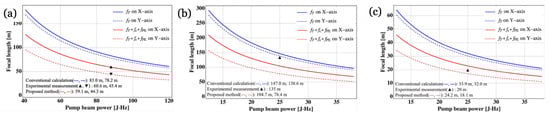 The focal lengths of the thermal lens, where the blue lines indicate the results of the conventional equations and red lines indicate the results obtained using the equations derived in this study, (a–c) is the case of [62,63,64], respectively.