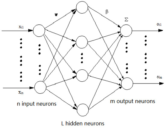 where, wi = [wi1, wi2, …, win]T is the weight between the i-th hidden layer neuron and the input neuron; βi = [βi1, βi2, …, βim]T is the weight between the i-th hidden layer neuron and the output neuron; bi represents the offset value of the i-th hidden layer neuron, wi·xj represents the inner product of wi and xj, and oj represents the output vector.