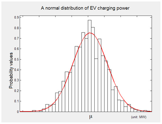 So according Equations (5)–(7), using the actual data from some wind field and photovoltaic power stations, the power ranges of fast and slow charging modes needed by the electric vehicle can be derived, and the charging power can be derived by a Monte Carlo method. The electric vehicle charging power obeys a normal distribution. The distribution curve of electric vehicle charging power is presented in Figure 3. The X-axis indicates the charging power of electric vehicle and the Y-axis indicates the probability value of the electric vehicle charging power, and this value has no unit. μ represents the average value of the electric vehicle charging power when its probability value is the largest, and its unit is MW.