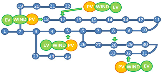 The access locations of wind, photovoltaic and electric vehicle are shown in Figure 4. With different combinations, there can be at least three cases for distributed generation. Case 1 represents one wind or one photovoltaic accessing one node; case 2 represents one wind and one photovoltaic access into two nodes, and case 3 represents wind and two photovoltaic access into three nodes, respectively. The candidate nodes for accessing wind, photovoltaic and electric vehicle are selected as follows: node 5, node 17, node 18, node 28 or node 32.