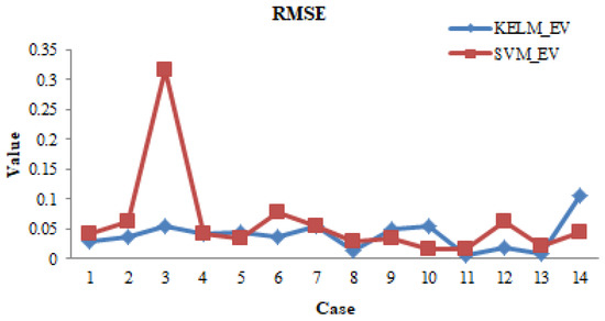 Figure 5 shows the average root mean square error value of kernel extreme learning machine under different access modes. The abscissa represents the different access modes of the distributed generation (shows in Appendix A Table A2), and the ordinate represents the value of the root mean square error (RMSE). It can be seen that the RMSE curve of the kernel extreme learning machine was relatively flat, and its average value is 0.04; the change of support vector machine is relatively large, and its average value is 0.062. A flatter curve corresponds to a smaller RMSE value, indicating that the prediction accuracy is better. Therefore, the kernel extreme learning machine prediction was better than that of the support vector machine.