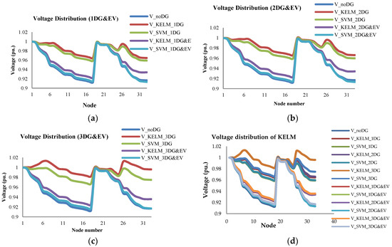 In Figure 7a–c, the dark blue curve in the figure corresponds to V_noDG, define as the initial voltage distribution of the network without distributed generation and electric vehicle. The red and green curves correspond to V_KELM_nDG and V_SVM_nDG, respectively define as the voltage distribution of the network when only distributed generation are connected, where n = [1, 2, 3] representing case1, case2, case3 respectively. The light blue and purple curves correspond to V_KELM_nDG&EV and V_SVM_nDG&EV respectively define as the voltage distribution when distributed generation and electric vehicles are connected at the same time.