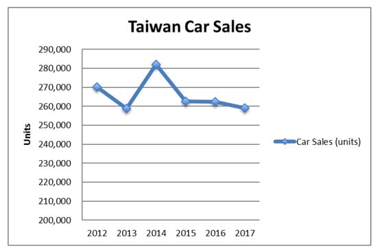 In addition, the service industry contributes to providing support for the manufacturing industry, in which the automotive industry plays an important role in the growth of the global economy [5]. This industry generates more than $2.5 trillion in revenue per year and corresponds, in general, to roughly 10% of the gross domestic product (GDP) of a developed country [6]. Based on global automobile sales data from year to year, there is a significant increase in GDP. According to data from the international organization of motor vehicle manufactures (OICA) regarding car sales from 2012–2017, in 2012, 82.11 million units were sold, increasing to 96.80 million units sold in 2017. Therefore, automobile sales grew by 17.89% during 2012–2017 [7]. Furthermore, based on data from OICA about car sales in Taiwan. Figure 1 shows automobile sales from 2012 to 2017 and a total of sales equal to 1,594,913 units (Source: http://www.oica.net/category/sales-statistics/). The graph presents 270,078 units from 2012; furthermore, it shows a decline in 2013 of 258,753 units and, in 2014, an increase of 282,130 units. However, 2015–2017 saw a decline from 262,593 to 259,013 units. Thus, the average sales amounted to 265,818.92 units per year, but there was a –4.09% decline in sales from 2012–2017.